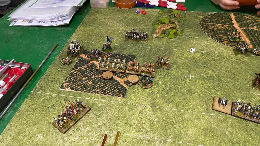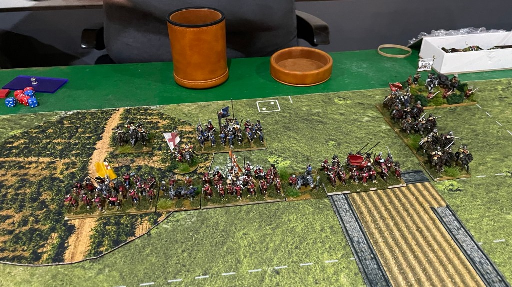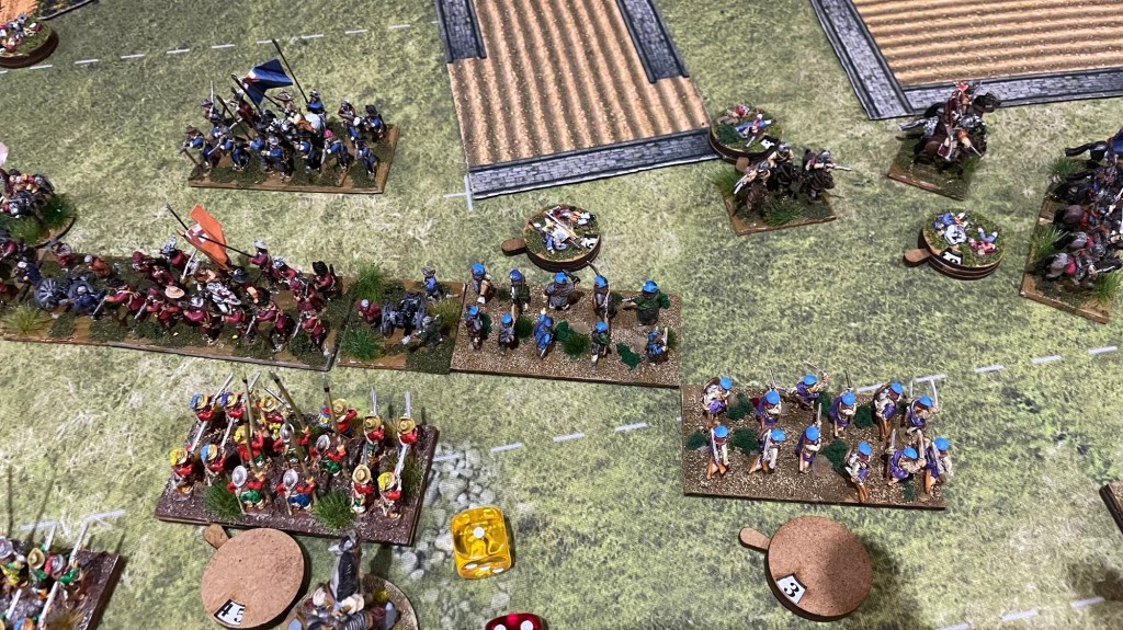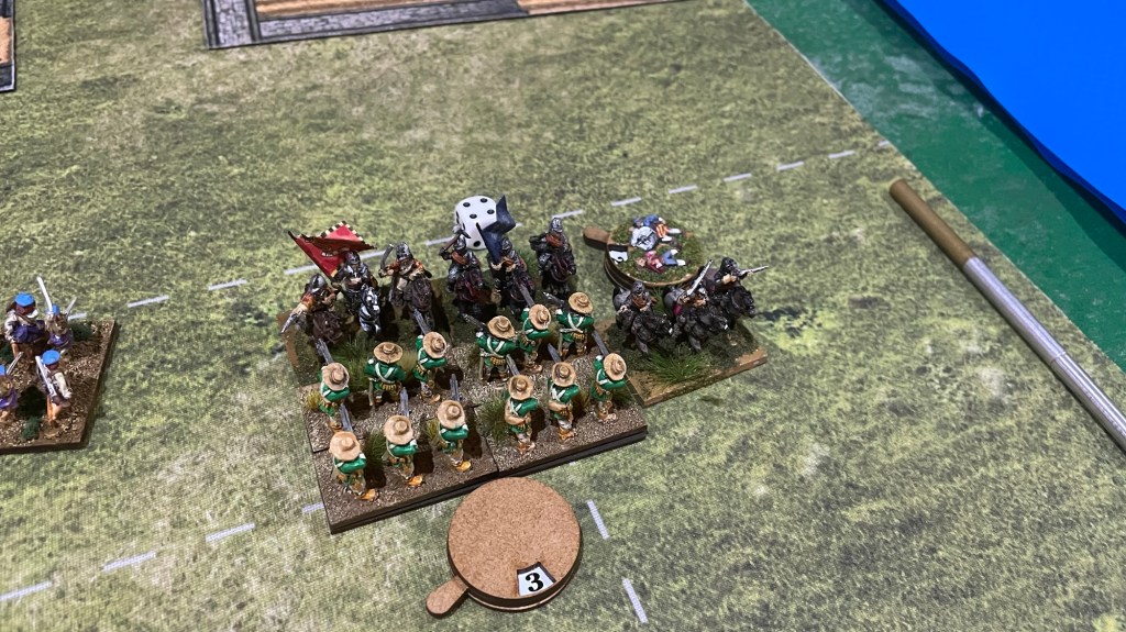 My right flank holds against the Ironsides. Two die and one break off. The elite general Ironside meanwhile breaks thru ….