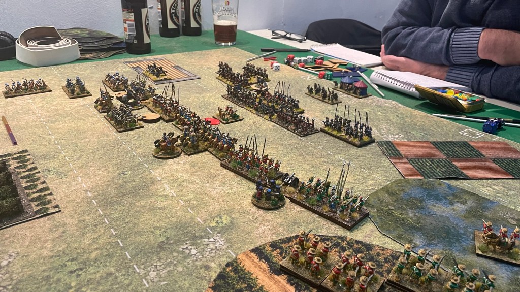 I deployed my Irish on my right, trying to get them into the gentle hill with a field on it. Stan surprised me with a flank march, which could only be on my left flank. My highlanders weren’t too happy about having to stop a flank march, most likely comprising of elite Curassiers.